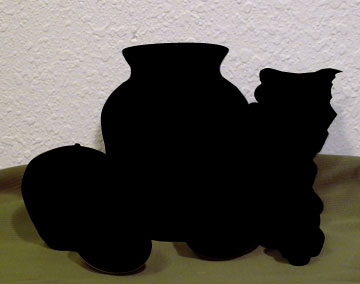 Each of the objects in the still life has mass and makes up the positive space. Below, I have silhouetted the shape of the positive space in black. You can see that it forms a very distinct shape in which separate objects are connected.