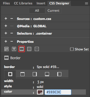 Jump to the Border category to add a border around the container div. Choose a border-width, border-style, and border-color.