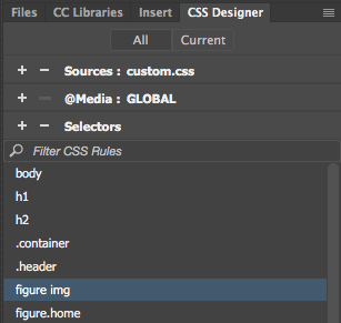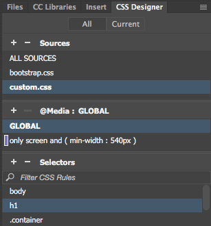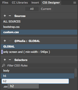 Create a new style to format the subheadings. Expand your CSS Designer panel. Choose custom.css, GLOBAL, and expand the list of selectors. It would be nice to list the h2 style after the h1 style, right? So first, select the h1 style in the list of selectors.