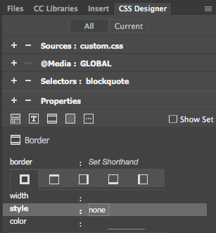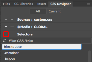 Create a new style to format the blockquote. Choose custom.css, GLOBAL, and click the + sign. Type blockquote as the selector name.