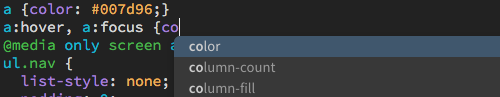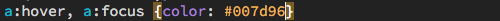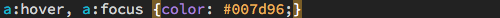 2. The hover and focus link states can be grouped together in a single style: a:hover, a:focus. When you type in the group selector, you have to be very careful to use a comma and a space mark between each pseudo selector: