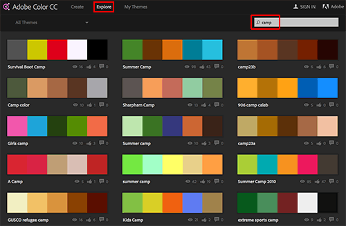 What colors make you think of summer camp? Head to Adobe Color CC. Click Explore and enter "camp" in the search field. You'll find hundreds of options.