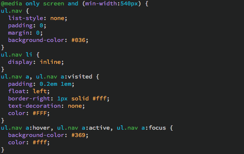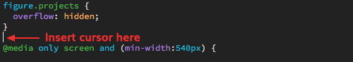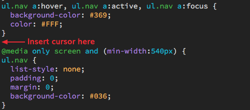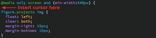 Open the custom.css file in the camp folder. Insert your cursor directly above the @media only screen and (min-width:540px) media query.