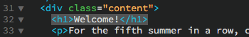 In Code View, the "Welcome!" title is wrapped in a h1 tag. |