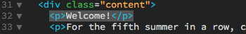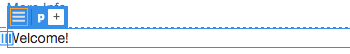 In Code View, the "Welcome!" title is wrapped in a p tag. |