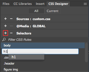 Now that you have your h1 tag, style it. Choose custom.css under Sources, GLOBAL under @Media. Click the + sign to create a new selector, then type h1 as the name. Press your return key (twice).
