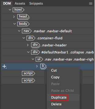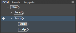 1. Toggle to Live View. Before you insert your first page element, expand the body using the DOM panel. Keep an eye on the DOM panel as you insert elements. The two script tags should stay at the bottom.