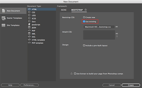 1. Go to File > New and create a new Bootstrap layout. You already have a Bootstrap CSS file in your dw1exercises folder, so you can select the "Use existing Bootstrap CSS" option. Uncheck "Include a pre-built layout". Click Create.
