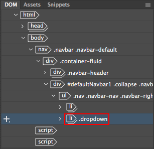 2. Toggle back to Live View and use the DOM panel to select the nav element. Use the Insert panel to insert a container (Bootstrap Components category) after the nav element.