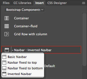 Choose the Bootstrap Components category in the Insert panel and click to insert a "Navbar". You can choose a "Basic Navbar" (with a white background) or an "Inverted Navbar" (with a black background). The "Navbar fixed to top" will stay in place, overlapping the content as the page scrolls.