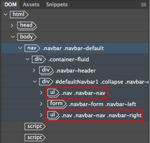 Use the DOM panel to expand the nav element. The nav element contains two unordered lists. The first list is aligned to the left. The second list is aligned to the right. Decide which list you want to use, then delete the other one. Also, delete the form element between the lists.