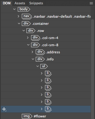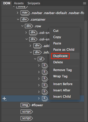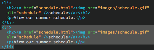 1. Toggle to Code View. Use the DOM panel to select the last list item. This will highlight the Schedule list item in the Code View window.