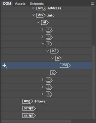 You can drag and drop elements directly in the DOM panel. Go ahead and try it out! Select the Biographies image, then drag and drop somewhere up the document tree. A green line will indicate the exact position of the image when you release. Choose (Ctrl/Cmd + Z) to undo the changes.