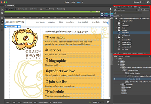 All these files are related—changes made to the CSS or JS files will affect the HTML file. The Related Files toolbar gives you quick access to all files.