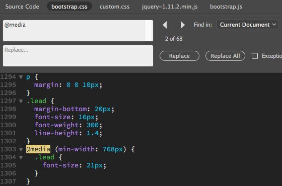 CSS media queries are making this happen. In Dreamweaver, switch to Code View and use the related files toolbar to toggle to the bootstrap.css file. Choose Find > Find and Replace (Command F). Type "@media" into the top search field, choosing "Find in: Current Document" from the dropdown menu. The first @media is a print media query which reformats the page content for printing. Click the right arrow to jump to the next occurrence. You'll see a media query which formats the "lead" text on large screens that are at least 768 pixels wide. Keep clicking the right arrow, and many more media queries will come up. Each media query is responsible for formatting content at a specific screen size.