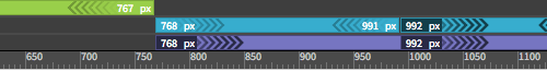 Each media query is color-coded. Green media queries have a maximum width, purple media queries have a minimum width, and blue media queries are defined with both minimum and maximum widths. |
