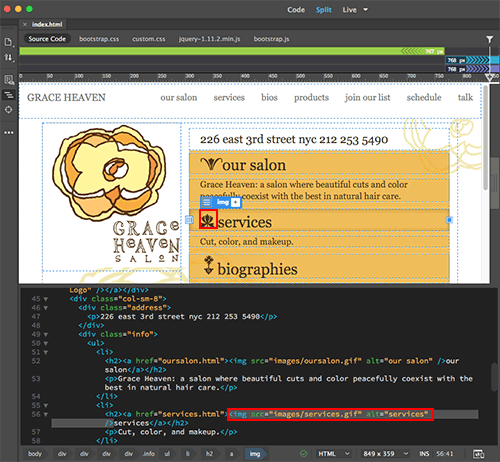Code View is synced with Live View, allowing you to make selections in Live View and edit them in Code View. Try this out: click the ornament next to "services". You'll see that exact image highlighted in the code.