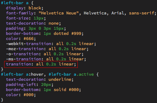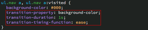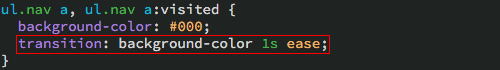 When the page first loads, the background-color is black (the start state). When the user mouses over a link, the background-color turns blue (the end state). The transition declaration is applied to the start state.