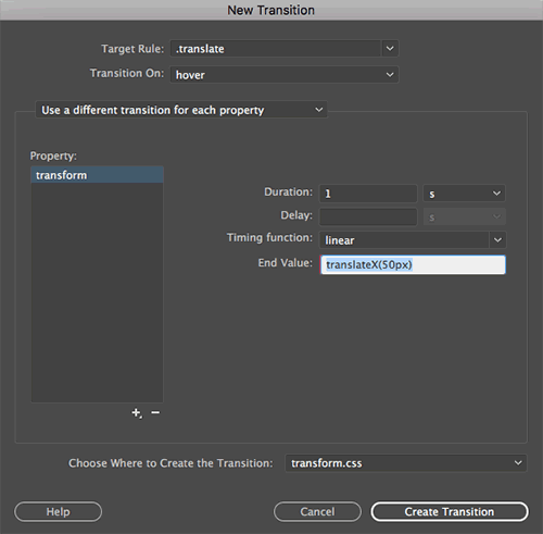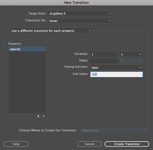 7. Save the transition in the opacity.css file, and click Create Transition.