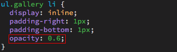 We put those boxes through a lot, didn't we? They might be feeling a little worn out, fading a little. Seems like the right time to talk about opacity transitions! Open the opacity.html file from the opacity folder. Expand the CSS Designer panel. Toggle to opacity.css and find the ul.gallery li style. Add a new property to set the opacity to "0.6".