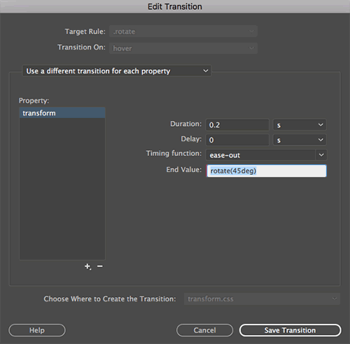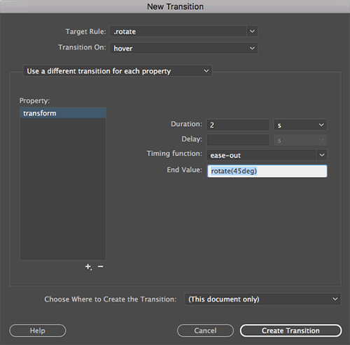 2. Choose "hover" from the Transition On menu (the transition will occur when you mouse over the .rotate div).