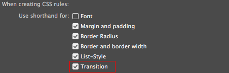 In fact, you can make Dreamweaver default to shorthand transitions! Go to Dreamweaver > Preferences (or Edit > Preferences on a PC). Choose the CSS Styles category, and select "Use shorthand for transition".