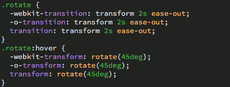 Toggle to the transform.css file to see how this magic works. On hover, the square is set to rotate 45 degrees. This transition is applied to the "transform" property. It takes place over a two second time period, and eases out.