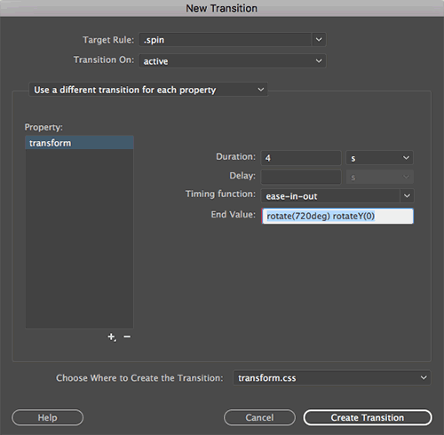 2. Choose "active" from the Transition On menu (the transition will occur when you click the .rotate div).