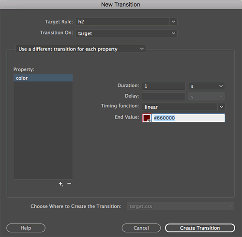Click the + sign in the CSS Transitions panel to create a new transition.