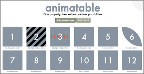 Lea Verou's animatable offers a smorgasbord of exciting CSS animation effects, all achieved—as she says in the header!—with any two values of (almost) any property. |