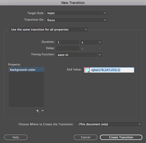 2. Choose "focus" from the Transition On menu (this transition will occur when you insert your cursor into a form field).