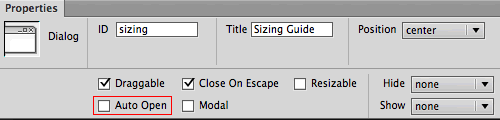 Click the blue jQuery tab to edit the dialog properties. Uncheck "Auto Open" so the dialog won't appear when the page first loads. Instead, choose "sizing-guide" as the trigger button.