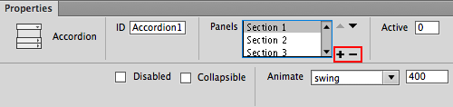 Toggle back to Design View and select the accordion by clicking the blue tab. Go to Window > Properties to open the Properties inspector. Here, you'll find all the controls you'll need to modify the accordion. Use the + icon to add panels, or the - icon to subtract panels.