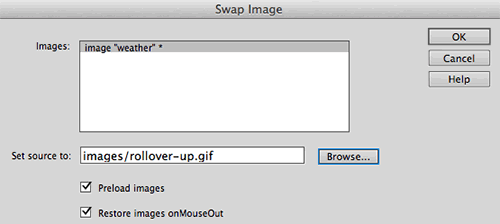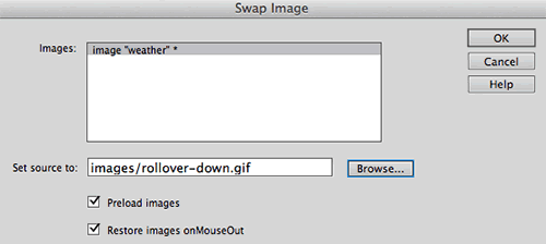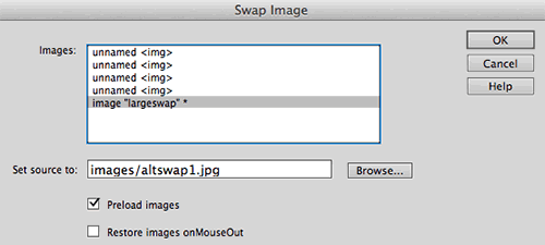 If you need to make a change, like selecting a different image file for one of the states, double-click the event handler in the Behaviors panel to open the swap dialog. Remember that you must select your image before you can see any of its behaviors in the Behaviors panel.