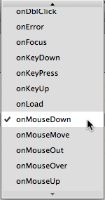 Access the events menu and choose a new event handler: onMouseDown. Before proceeding, preview your page in the browser to see if the down state works with your initial swap.