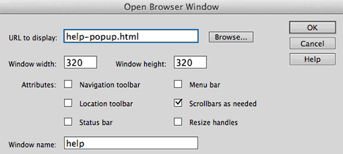 Browse to the path or URL of the page you plan to pop and enter in the size you'd like this window to appear. Give it a name—again, a good habit—which will also make it possible to easily target this window with other links if you choose.