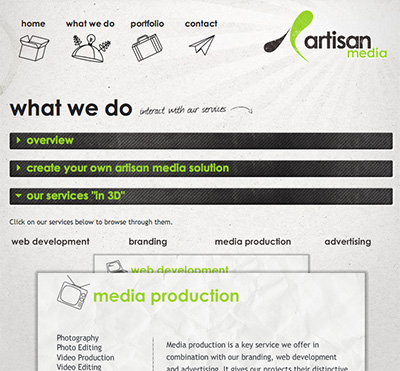 Miami Web design studio Artisan Media features an accordion menu on their "What We Do" page. This menu provides a neatly organized set of options that keep the user in control, and the vertical stacking is a nice complement to the horizontal navigation bar at the top. |