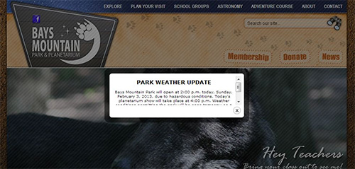 Pop ups don't have to be annoying! This pop up alert for the Web site of Tennessee city park Bays Mountain serves an important purpose: it alerts visitors to bad weather and closures. Click here to read about ITD Interactive's design process for this site, including their pop up strategy. |