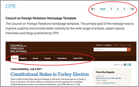 Tabs don't have to be complicated to work well. Concentric Studio's portfolio of their site designs features unobtrusive tabbed navigation with subtle gradients to make the chosen tab stand out. And look—there's another style of tabbed navigation on the home page template they built for the Council on Foreign Relations! |