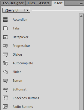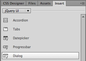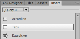 Choose Design View to access these jQuery UI elements. The Insert panel's jQuery UI category is not accessible from Live View. |