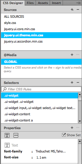 As always, the CSS Designer panel is there for your styling needs. Edit the following styles in the jquery.ui.theme.min.css file: