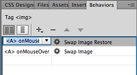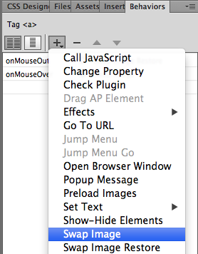 the plus sign icon in the Behaviors panel, choosing Swap Image from the list of behaviors.