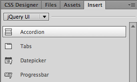 Switch to Design View. Insert your cursor inside the gridContainer div. Expand the Insert panel and choose the jQuery UI category. Click Accordion.