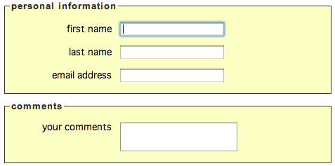 3. Group related form elements into fieldsets. For example, you might create separate fieldsets for "personal information" and "comments." Fieldsets divide long forms into manageable sections. The legend tag provides a descriptive title for each fieldset.