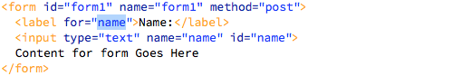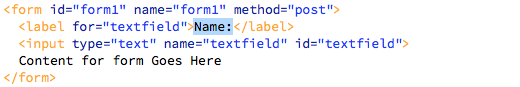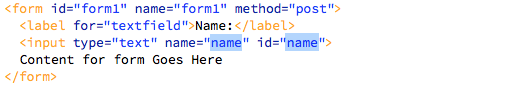 If you have more than one textfield, you'll want to change the name and ID to something more specific. We are using this textfield to collect the user's name, so change the name and ID of the input to "name":