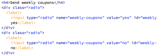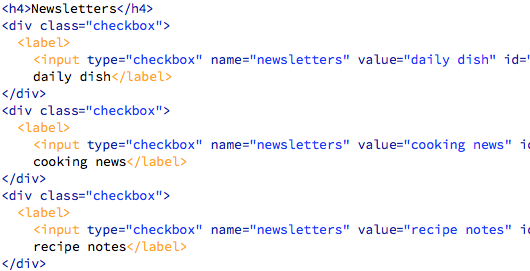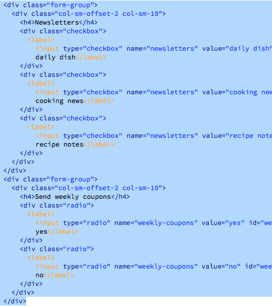 One more! In Code View, select the "Newsletters" heading, the checkbox group, the "Send weekly coupons" heading, and the radio button group.