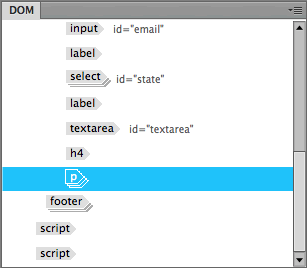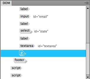 You'll notice that we do a lot of switching back and forth between Live View and Code View as we build this form. When you insert form elements in Live View, you get an accompanying label tag along with the input. When you insert form elements in Code view, you just get the input. This is why I always insert form elements in Live View. However, I've found that it is quicker and more precise to edit the names, IDs, and "for" attributes in Code View. Hence the toggling, but it all pays off!