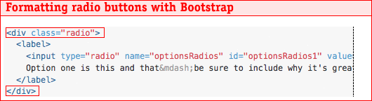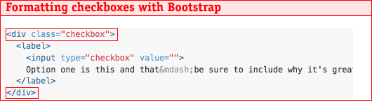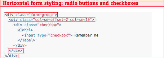 Radio buttons and checkboxes are nested inside two divs. The first div has a class of "col-sm-offset-2 col-sm-10". The offset property pushes the checkboxes over two columns. The second div has a class of "form-group".
