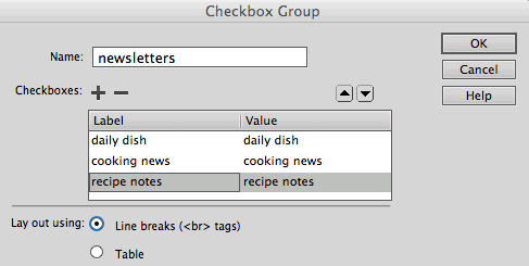 The Checkbox Group dialog offers layout choices of "line breaks" or "table". Choose "line breaks" if you are planning to control the form layout using CSS. |