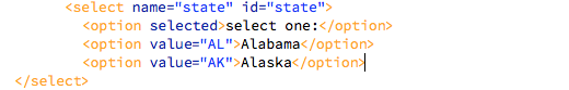 Entering all 50 states would be quite a chore, but luckily, a quick Google search results in a list of select values from freeformatter.com. Copy the options starting from "Arizona" on down (you don't need the <select> tags)